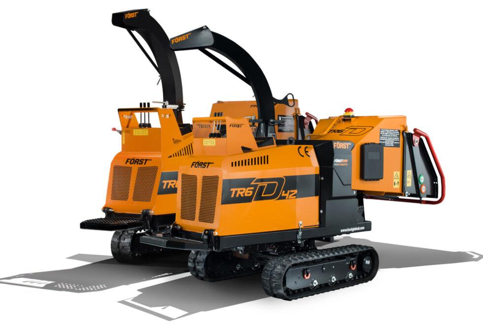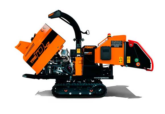 Först hakselaar ∅ 16 cm met dieselmotor 42 pk, gemonteerd op rupsen