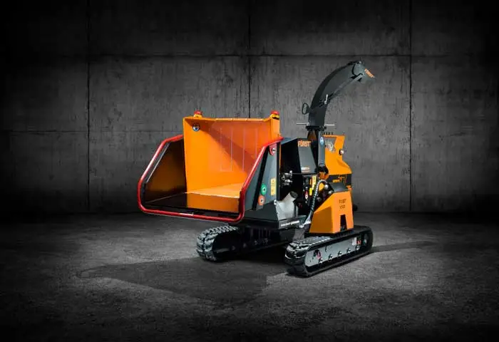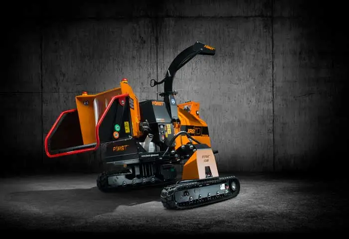 Först hakselaar ∅ 21 cm met dieselmotor 55 pk, gemonteerd op beweegbare rupsen